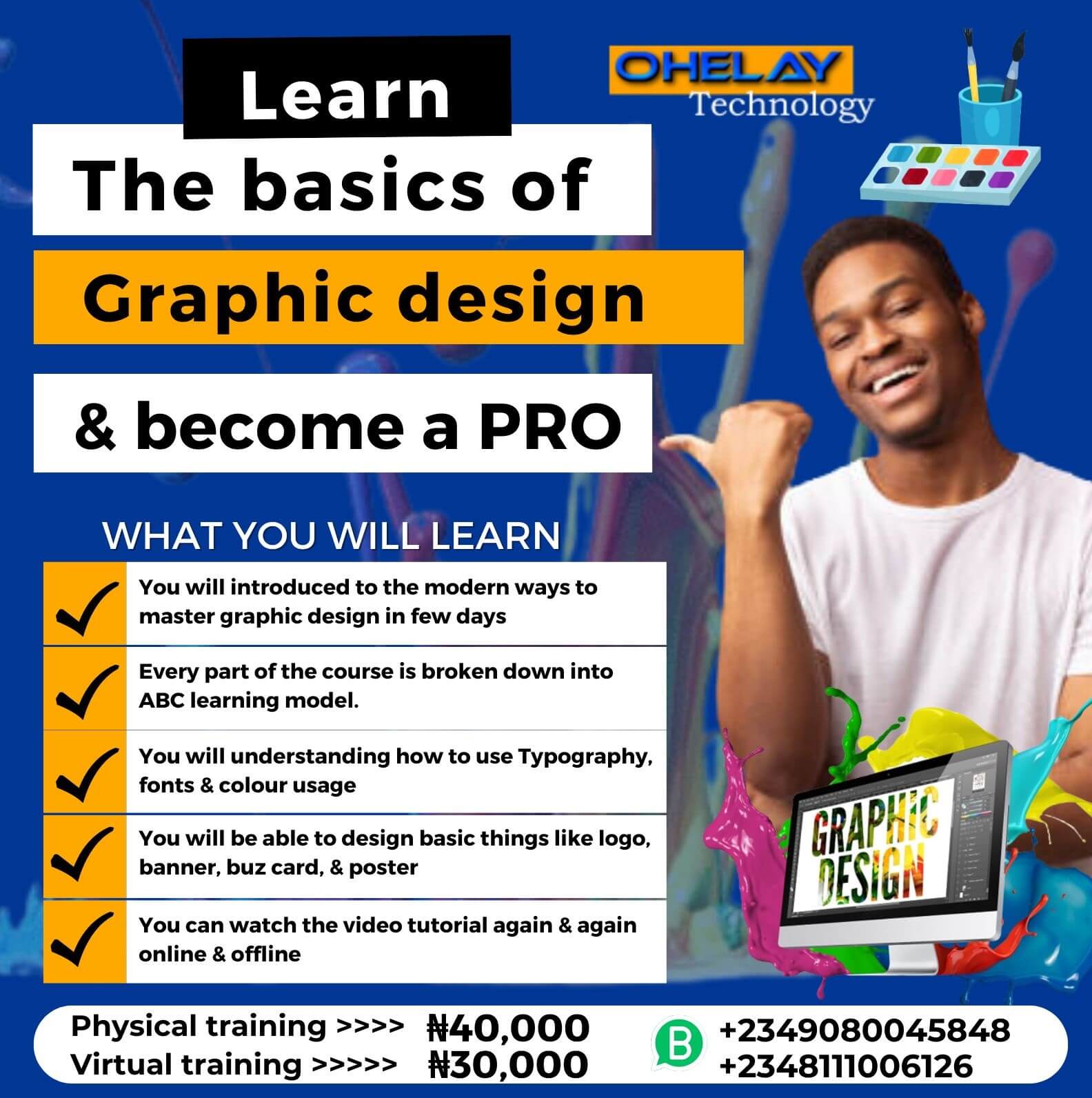 On-Demand Course Ohelay digital skill course for business professionals ....... OUR COURSES Front End Fundamental of website design. Beginner 2h 24m start now Front End Video editing masterclass course Intermediate 4h 36m start now Front End Mastering the art of graphic design. Beginner 3h 18m start now